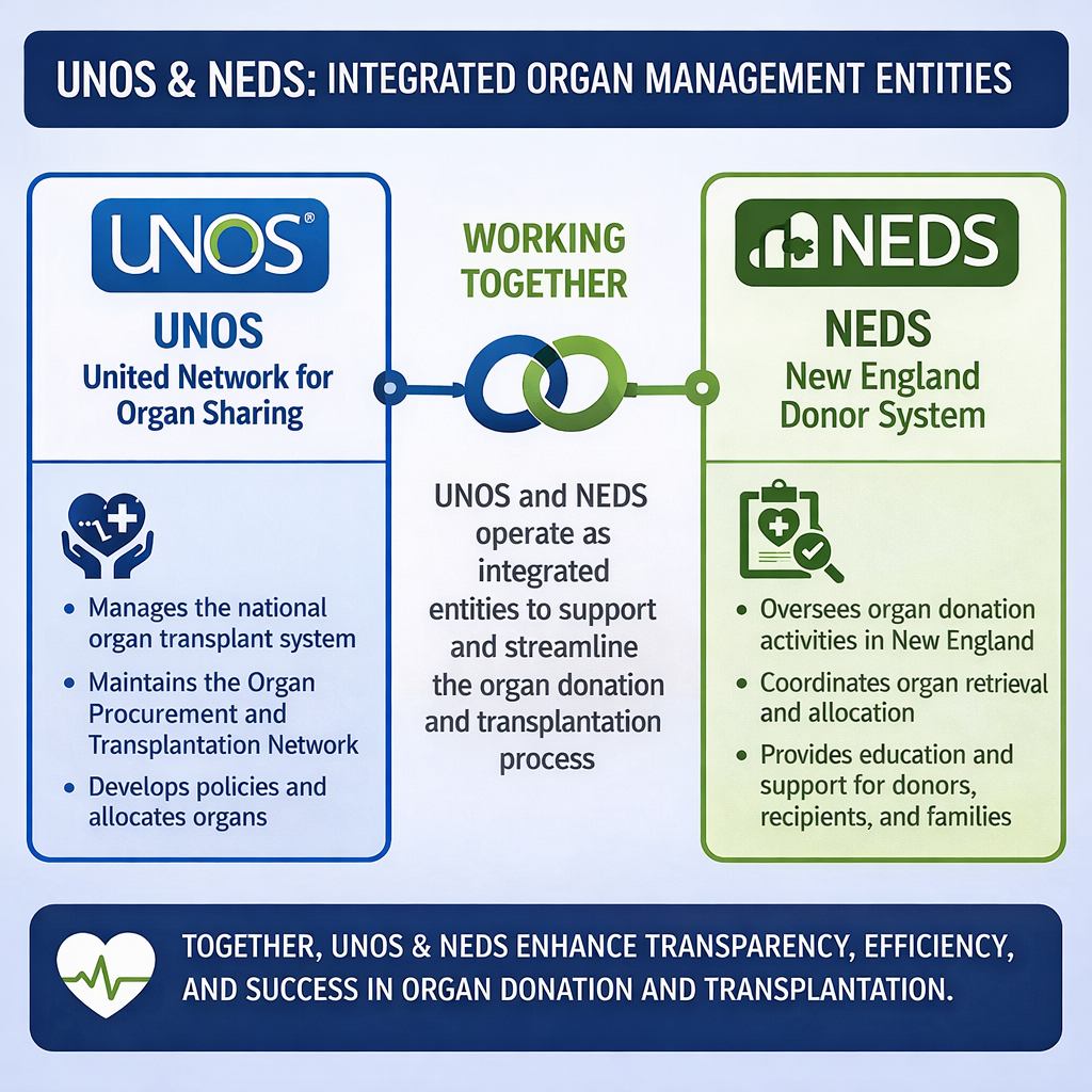 NEDS operates and controls the area that I live, Boston metro. NEDS and UNOS play separate but tightly integrated roles in managing transplant organs. NEDS main role is the collection and delivery of the donated organs, in my situation, hearts. Summarized as follows: