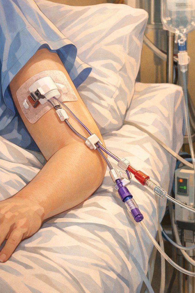 Every day blood is drawn and checked several times. The good news is that the blood is drawn through a PICC line. PICC stands for Peripherally Inserted Central Catheter. The PICC line gets placed early in the admission process with ultra sound guidance and stays there until discharge. This eliminates needle sticks for blood draws. It also facilitates other medical purposes like IV meds etc.